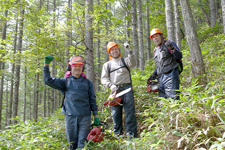 苗木を山に植栽(植え付け)する前には、苗木の生育環境をよくするため、雑草や灌木などを取り除く「地拵え」という整地作業をします。地拵えは林業の中でも大変な作業ですが、気を育てる過程の中で最初に行う重要な仕事です。